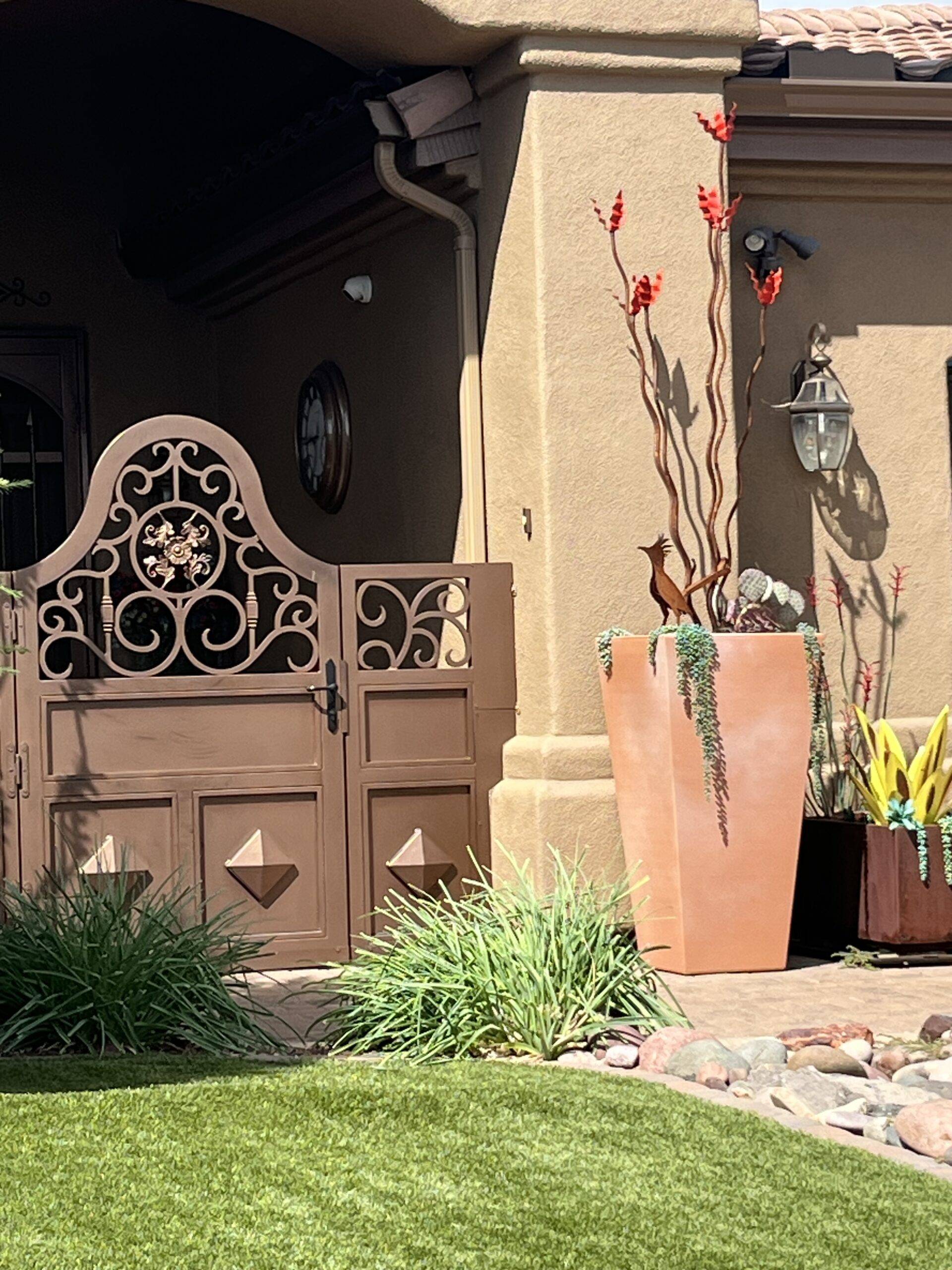 “Recently, while driving around through our beautiful town of Prescott, my friends and I came across a colorful, creative and gorgeous garden located at 3398 Bar Circle A Road.    The owners, Ann Friday and Larry Springer, have incorporated evergreen shrubs with native plants and colorful grasses.  Their mature garden is the result of multiple plantings to create a wildlife-resistant landscape (SHHH…Don’t tell the javelina or deer!) Pruning the Deodar Cedar keeps it contained and healthy for the garden size, while small ground covers and Gopher plants are tucked away between rocks and boulders, softening the landscape. The huge ‘Dinner Plate Cactus’  really shouldn’t be thriving in our Prescott environment, but Ann and Larry coddled it until it grew into the beautiful plant it is now. Look for the colorful metal garden art that brightens up the front of the home. The garden owners and the Alta Vista Garden Club invite you to drive or wander past to see and enjoy this season’s featured garden during the month of October.  You really won’t want to miss this garden!”
